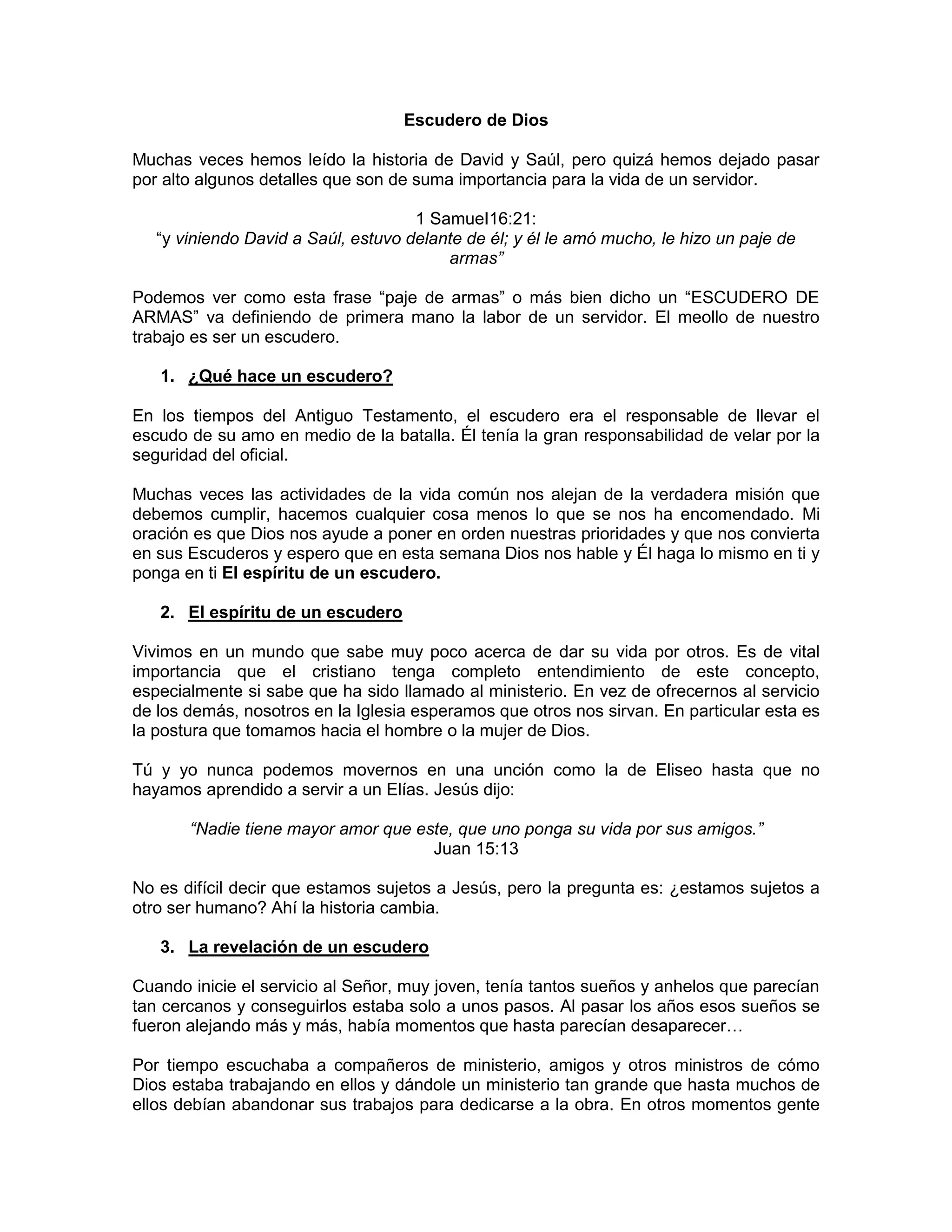 El documento habla sobre el papel de un escudero y su importancia para apoyar y proteger al líder espiritual. Un escudero debe servir a su líder con humildad, respeto y obediencia, anteponiendo los deseos y visión del líder por encima de los propios. Al someterse completamente a la autoridad del líder, un escudero permite que el ministerio y los sueños del líder se cumplan.