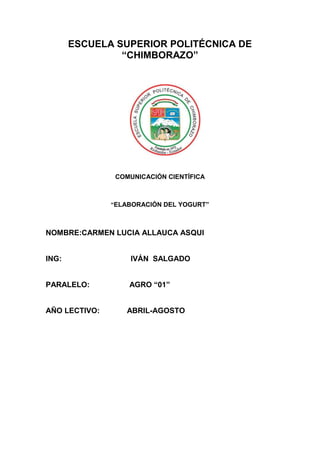 El documento describe el proceso de elaboración del yogurt, incluyendo los ingredientes y pasos necesarios. Explica que la leche se pasteuriza, enfría, inocula con fermentos lácticos, incuba y envasa. También destaca los beneficios nutricionales del yogurt y su popularidad a nivel mundial.