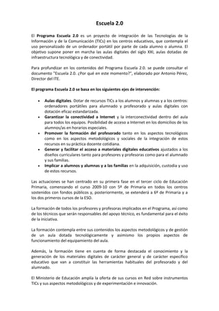 El Programa Escuela 2.0 tiene como objetivo dotar las aulas del siglo XXI de infraestructura tecnológica y conectividad mediante la provisión de ordenadores portátiles a estudiantes y maestros, acceso a Internet en las aulas y hogares, formación del profesorado en tecnología e integración pedagógica, y desarrollo de materiales educativos digitales. Se enfoca inicialmente en quinto y sexto grado de primaria y los dos primeros años de secundaria.