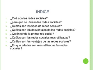 Este documento resume las redes sociales. Define una red social, explica sus propósitos y tipos principales. Detalla las ventajas e inconvenientes de las redes sociales, quién fundó la primera y las más utilizadas actualmente. Finalmente, indica que las redes sociales son usadas principalmente por personas menores de 35 años.