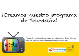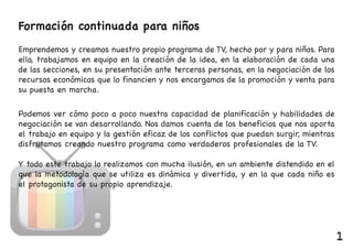 Los niños crean su propio programa de televisión para desarrollar habilidades emprendedoras y de comunicación. Aprenden sobre planificación, trabajo en equipo, resolución de conflictos, toma de decisiones, comunicación pública y administración de recursos financieros a través de actividades como la creación del programa, entrevistas, debates e informes noticiosos. El objetivo es fomentar la iniciativa, creatividad, responsabilidad y habilidades empresariales de los niños.