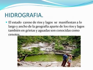 El documento proporciona información sobre la geografía, clima, biodiversidad, economía, idiomas, industria, gobierno y otros aspectos de Yucatán. Carece de ríos y lagos importantes, tiene un clima cálido, alberga una amplia biodiversidad de aves, su economía se basa en el turismo y la agricultura, la lengua maya es la más hablada, tiene industrias azucareras y la constitución establece tres poderes.