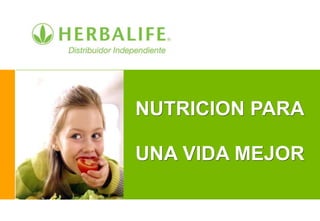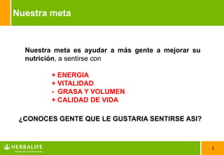 Este documento trata sobre nutrición para mejorar la salud. Su meta es ayudar a las personas a sentirse con más energía, vitalidad y calidad de vida mediante una nutrición equilibrada. Explica que las células necesitan más de 114 nutrientes diferentes cada día para funcionar correctamente y formar los tejidos, órganos y sistemas del cuerpo. También advierte sobre los problemas de salud causados por excesos y deficiencias nutricionales. Finalmente, promueve un desayuno saludable de dos pasos basado en agua, aloe