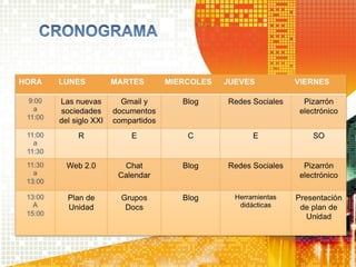 El documento describe un programa de capacitación para profesores que tiene como objetivos capacitar a los profesores en el uso de herramientas tecnológicas como la computadora y la Web 2.0 para mejorar la enseñanza, derribar obstáculos al uso efectivo de la tecnología y enriquecer el proceso de enseñanza-aprendizaje de profesores y alumnos. El programa consta de 5 módulos que cubren temas como las sociedades del siglo XXI, herramientas de Google y redes sociales, con el fin de produ