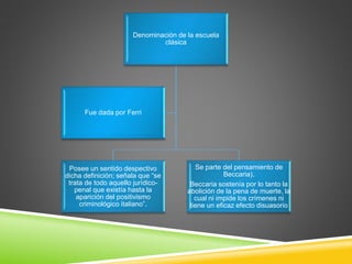La escuela clásica se refiere a las doctrinas jurídico-penales que existían antes del positivismo criminológico italiano en el siglo XIX. Partía de una visión ideal del ser humano y basaba sus fundamentos filosóficos en el derecho natural. Se caracterizaba por utilizar un método deductivo y ver al delito como un ente jurídico, a diferencia de la escuela positiva que lo ve como un fenómeno fáctico. Sus postulados fundamentales incluían el respeto al principio de legalidad y que la pena es la