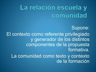 El documento aborda la responsabilidad de las escuelas de integrar el conocimiento con la participación social, considerando el contexto y la comunidad como elementos clave en la formación. Resalta la importancia de la comunidad educativa, compuesta por diversos actores, en la gestión y organización escolar, así como la necesidad de construir consensos para generar proyectos comunitarios. Además, destaca que las instituciones deben adaptarse y comprender los cambios en su entorno para mantener su relevancia.