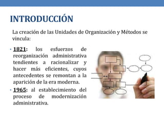 Este documento presenta una introducción a la organización y procesos empresariales. Explica que la creación de unidades de organización y métodos se vincula con los esfuerzos de reorganización administrativa desde 1821 hasta 1965 cuando se estableció el proceso de modernización administrativa. Las empresas deben ser competitivas para sobrevivir. La organización y procesos empresariales ayudan a optimizar la estructura, sistemas y procesos de una empresa para que sea más eficiente y efectiva.