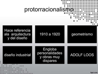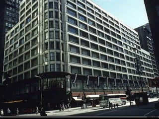 Este documento describe el protorracionalismo americano y la Escuela de Chicago entre 1910 y 1920. Se caracterizó por el uso de nuevos materiales como el hormigón armado y el vidrio industrial, y por estructuras metálicas que permitían construir edificios altos. Figuras clave fueron Sullivan, Burnham y Richardson, quienes promovieron el funcionalismo y la forma siguiendo a la función. La Escuela de Chicago dio origen a los primeros rascacielos modernos en Estados Unidos.