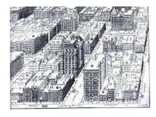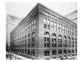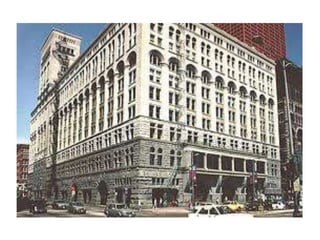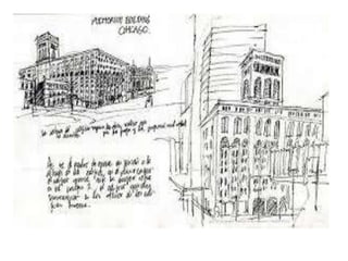 El documento menciona varios edificios y estructuras arquitectónicas en Chicago, como la Escuela de Chicago, Casa Harboe y el Edificio Sullivan. También se hace referencia a otras casas significativas en Madrid y Pensacola. La lista incluye una variedad de instituciones y propiedades relacionadas con el diseño arquitectónico en diferentes ubicaciones.