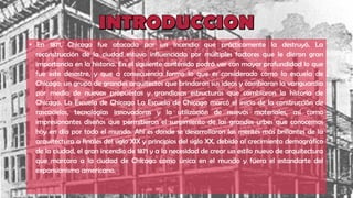 El documento detalla la influencia del gran incendio de 1871 en Chicago, que llevó a la creación de la Escuela de Chicago, pionera en la construcción de rascacielos y el uso de nuevas tecnologías arquitectónicas. También se aborda la evolución de la Bauhaus, escuela de diseño fundada por Walter Gropius en 1919, su enfoque en la unión de arte y artesanía, y su impacto en la arquitectura moderna hasta su cierre en 1933 por el régimen nazi. Se destacan momentos clave, como la participación de importantes artistas y la transición hacia un enfoque más racionalista en el diseño.