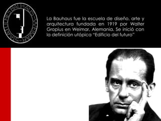 La Bauhaus fue una escuela de arte y diseño fundada en Alemania en 1919 por Walter Gropius. Se centró en el funcionalismo y la estética minimalista, utilizando formas geométricas, colores primarios y materiales modernos. La escuela se trasladó de Weimar a Dessau en 1925 y luego a Berlín en 1932, donde impartió talleres de carpintería, textiles, impresión y fotografía antes de ser cerrada por los nazis en 1933.