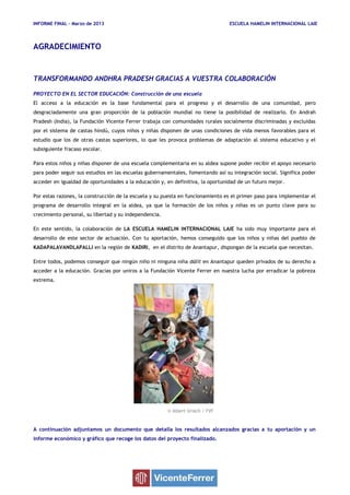 Este informe resume el proyecto de construcción de una escuela en la aldea de Kadapalavandlapalli, India, financiado por la Escuela Hamelin Internacional Laie. La escuela se completó en noviembre de 2013 y ahora proporciona educación a los niños de la aldea. El proyecto costó 11,245 euros y garantiza el derecho a la educación de los niños al proporcionarles un espacio seguro para aprender.