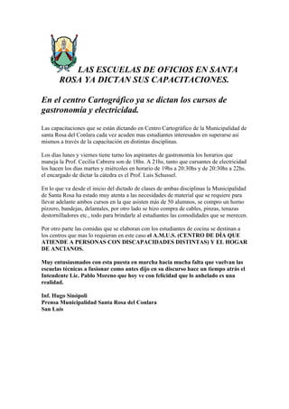 Las Escuelas de Oficios en Santa Rosa ya dictan sus capacitaciones. Se están dictando cursos de gastronomía y electricidad en el Centro Cartográfico, con más de 50 estudiantes interesados en cada disciplina. La Municipalidad ha proveído materiales como un horno pizzero, cables y herramientas para los cursos. La comida preparada en los cursos de cocina se destina a centros locales que atienden a personas con discapacidad y ancianos.