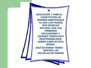 Este documento describe las escuelas de padres, madres y apoderados, incluyendo su justificación, objetivos, metodología y temas abordados. Explica que la educación y la familia son inseparables, y que las escuelas de padres buscan proporcionar herramientas educativas a los padres para mejorar su capacidad de educar a los niños. Describe objetivos como apoyar el desarrollo de los niños, informar a los padres sobre temas de desarrollo, y enseñar técnicas para el apre