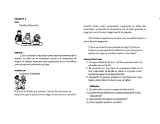 Este taller presenta una fábula sobre un cangurito que permanece siempre dentro del bolsillo de su madre cangura, sin poder explorar el mundo por sí mismo ni hacer preguntas. A medida que crece, su madre le va prohibiendo diferentes acciones hasta que el cangurito termina encerrado en el tronco de un árbol, sin haber vivido plenamente. El objetivo es concientizar a los padres sobre la importancia de desarrollar la autonomía y libertad en los hijos para que sean personas responsables.