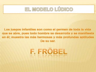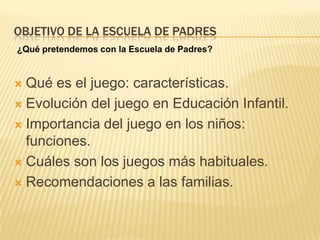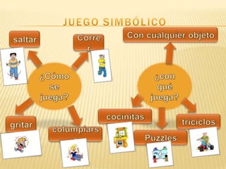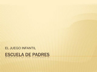 El documento habla sobre la importancia del juego infantil. Explica que el juego es una actividad natural en los niños que les permite descubrir el mundo, aprender reglas sociales, y expresar emociones. También describe la evolución del juego y cómo este contribuye al desarrollo motor, cognitivo, social y emocional del niño. Finalmente, da recomendaciones a las familias sobre proveer tiempo y espacio para que los niños jueguen.