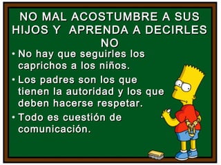 Este documento ofrece consejos para padres sobre cómo establecer límites con sus hijos y no malacostumbrarlos. Recomienda que los padres no cedan ante cada capricho de los niños y en su lugar establezcan autoridad. También advierte que cumplir todos los deseos de los hijos los hará dependientes y les enseñará que siempre obtendrán lo que quieran, en lugar de aprender sobre responsabilidades y límites.