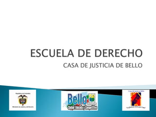 El documento habla sobre las Casas de Justicia de Bello. Ofrecen facilidad a las comunidades para acceder a la administración de justicia de manera formal e informal, con el propósito de generar espacios para el manejo pacífico de conflictos. Tratan conflictos familiares, violencia intrafamiliar, problemas entre vecinos, deudas, y ofrecen asesoría jurídica y apoyo psicológico. Explica también la violencia intrafamiliar y sus formas, así como la legislación y procesos relacionados.
