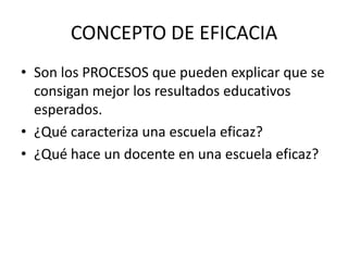 Una escuela eficaz depende de factores como el liderazgo pedagógico del director, una visión y objetivos compartidos, un ambiente que estimule el aprendizaje, poner la enseñanza-aprendizaje como centro de actividad, mantener expectativas elevadas, reforzar positivamente a estudiantes y profesores, supervisar el progreso, asignar responsabilidades a los estudiantes, enseñar con propósito, promover el aprendizaje organizacional, fomentar la colaboración entre familia y escuela,