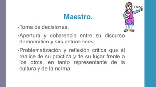 El documento describe los principios de un ambiente de aprendizaje ideal, incluyendo una escuela con fronteras permeables, un maestro democrático, y un aula con una estructura de comunicación bidireccional. También propone actividades opcionales, cooperativas y simultáneas para los estudiantes.