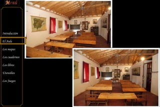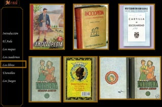 Este documento describe los aspectos típicos de las escuelas de los años 50 en España, incluyendo la presencia de signos religiosos y políticos, el uso de mapas y láminas ante la falta de medios audiovisuales, libros de enciclopedias comunes, la recolección de fondos para obras de caridad, el uso de útiles de madera como reglas y compases, el pizarrín y plumillas para escribir, y juegos sencillos aunque a veces peligrosos como el tirachinas.