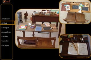 Este documento describe aspectos típicos de las escuelas de los años 50 en España, incluyendo la presencia de signos políticos y religiosos, el uso fundamental de mapas y láminas ante la falta de medios audiovisuales, enciclopedias populares como referencia, la recolección de fondos para el Domund, el uso de útiles como reglas y compases de madera, el pizarrín y plumillas como herramientas de escritura, y juegos sencillos aunque a veces peligrosos como el tirachinas.