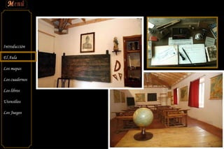 Este documento describe las características típicas de las escuelas en los años 50, incluyendo la presencia de símbolos políticos y religiosos, el uso de mapas y láminas para apoyar la enseñanza ante la falta de medios audiovisuales, libros de referencia comunes como las enciclopedías Álvarez o Dalmau Carles, la recolección de fondos para el Domund, el uso de útiles como reglas y compases de madera, el globo terráqueo, pizarrines y tinteros de pupitre, y j