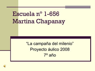 Este documento describe un proyecto escolar realizado por alumnos y docentes de 7o año de la Escuela No 1-656 Martina Chapanay sobre los Objetivos de Desarrollo del Milenio. El proyecto buscó relacionar cada unidad didáctica con un objetivo de la Campaña del Milenio para que los estudiantes puedan involucrarse y contribuir a su cumplimiento. Los alumnos investigaron sobre la pobreza, desnutrición y mortalidad infantil y expusieron los resultados de su trabajo.