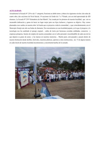 La Escuela No 239 fue creada en 1935 con 127 estudiantes en una pequeña construcción de madera. En 1952, el edificio actual fue construido durante el gobierno de Perón. Actualmente, la escuela atiende 420 estudiantes en doble turno con niveles que van desde 4 años hasta 7o grado. La escuela ha crecido para servir a toda la comunidad local y celebró recientemente sus 80 años.
