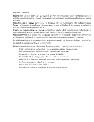 La Escuela Nueva propone un modelo educativo centrado en el estudiante, donde el profesor deja de ser el punto central y se convierte en un dinamizador al servicio de los intereses de los alumnos. Surge en Europa a finales del siglo XIX como alternativa a la enseñanza tradicional y se consolida en el siglo XX. Pioneros como Rousseau, Pestalozzi, Froebel y Herbart sentaron las bases con nuevos enfoques centrados en el desarrollo del niño. La Escuela Nueva promueve el aprendizaje