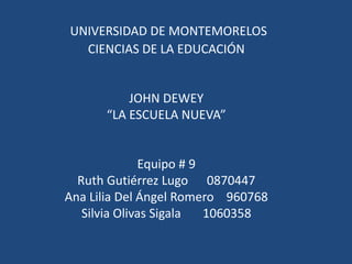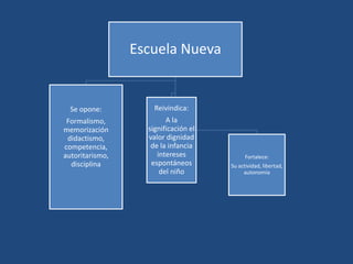 El documento resume las ideas educativas de John Dewey y William Kilpatrick. Dewey promovió una "escuela nueva" que respeta la infancia, fomenta el desarrollo del niño a través de la libertad y la naturaleza, y se centra en los intereses del estudiante. Kilpatrick desarrolló el "método de proyectos", donde los estudiantes trabajan en grupos para resolver problemas complejos mediante la investigación y presentación de proyectos. Ambos pedagogos rechazaron los enfoques formales y autoritarios, y enfatiz