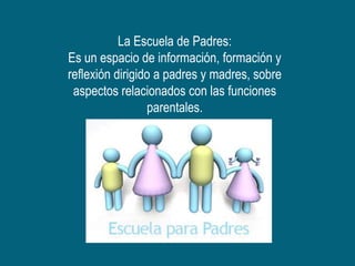 La Escuela de Padres tiene como objetivo principal proporcionar a los padres estrategias y recursos para comprender y apoyar el desarrollo de sus hijos en los ámbitos emocional, académico y social. También busca ayudar a los padres a establecer una buena comunicación con sus hijos y conocer métodos efectivos para apoyar su superación académica y el desarrollo de valores. La metodología de la Escuela de Padres pretende que los padres construyan conocimientos que les permitan resolver problemas de la vida cotidiana