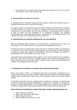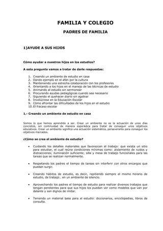 Este documento ofrece consejos a los padres sobre cómo ayudar a sus hijos en los estudios. Propone 1) crear un ambiente de estudio en casa, 2) dar ejemplo con el afán por la cultura, y 3) mantener una estrecha colaboración con los profesores. También recomienda orientar a los hijos en las técnicas de estudio, animarlos al estudio sin sermonear, y procurar ayudas pedagógicas cuando sea necesario.
