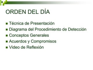 El documento presenta la orden del día de una reunión sobre la escuela para todos que incluye temas como la técnica de presentación, el procedimiento de detección de necesidades educativas especiales, conceptos generales y acuerdos. Se definen conceptos como integración, necesidades educativas especiales, barreras de aprendizaje, problemas de aprendizaje y discapacidad. Finalmente, se indica que los principales obstáculos que enfrentan los niños con necesidades especiales son las barreras humanas como la falta de sensibilidad e información.