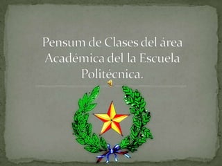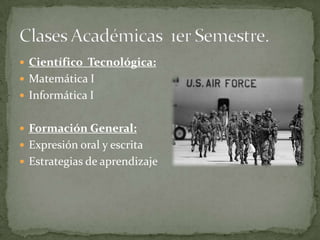 El documento presenta el plan de estudios de una academia militar, dividiendo la formación en diferentes áreas como ciencias técnicas, formación general, y especializaciones por arma (infantería, caballería, etc.). Detalla las asignaturas para cada semestre, con énfasis en aspectos tácticos, técnicos y de liderazgo de cada arma.