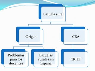 El documento analiza la importancia de las escuelas rurales en España, destacando sus funciones educativas y los desafíos que enfrentan los docentes, como el aislamiento y la falta de recursos. Se mencionan los Colegios Rurales Agrupados (CRA) y Centros de Recursos de Educación Integral (CRIE) que apoyan a estas instituciones. También se resalta la atención individualizada y la participación activa de los alumnos en estos entornos educativos.