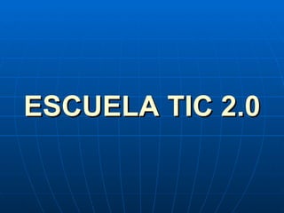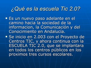 La Escuela TIC 2.0 es un proyecto de la Junta de Andalucía para transformar las aulas de 5o y 6o de Primaria y de 1o y 2o de ESO en centros públicos en aulas digitales con pizarras interactivas y acceso inalámbrico a Internet, proporcionando ordenadores portátiles a estudiantes y profesores. El proyecto busca mejorar la calidad educativa a través de las tecnologías, cambiando el modelo de enseñanza de uno unidireccional a uno más abierto y flexible cent