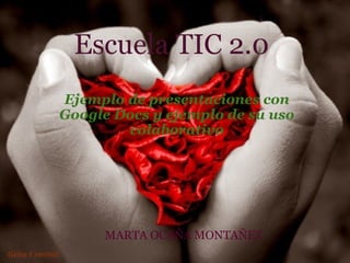 Este documento presenta un ejemplo del uso colaborativo de Google Docs para crear presentaciones. Contiene comentarios de varios usuarios sobre un curso de recursos TIC para el aula y una discusión sobre si una imagen muestra un pato o un conejo.