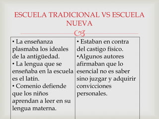 El documento compara la escuela tradicional y la nueva escuela. La escuela tradicional se centraba en el maestro y el castigo físico, mientras que la nueva escuela promovía la autodisciplina de los estudiantes, el aprendizaje en la lengua materna y actividades creativas. También describe los sistemas Oakland y Trinidad, que propusieron la clasificación de estudiantes y enseñanza individualizada basada en su inteligencia.