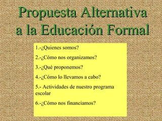 Este documento presenta una propuesta de una comunidad educativa alternativa llamada KomUnidad Educativa Wenuleufü. La comunidad se organiza de forma horizontal y ofrece una educación integral para niños basada en el respeto, la participación, el desarrollo personal y las relaciones comunitarias. El programa educativo incluye actividades académicas, artísticas y de aprendizaje práctico. La comunidad se financia de forma autogestionada a través de cuotas de los padres y donaciones.