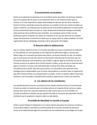 Este documento resume varios aspectos de la vida escolar de los estudiantes de secundaria. Explica cómo los estudiantes se adaptan a las reglas de la escuela a su manera y cómo la cultura de la escuela influye en ellos. También discute las percepciones de los estudiantes y maestros, la acumulación de conocimiento, y el sentido de identidad que desarrollan los estudiantes como parte de un grupo escolar. Finalmente, analiza algunos significados que la escuela tiene para los estudiantes y las exigencias recíprocas entre estudiantes y