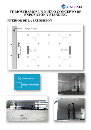 El documento presenta un nuevo concepto de escuela móvil y exposición itinerante. Consiste en un remolque con bodegas exteriores que se puede desplegar para maximizar el espacio interior y ofrecer una exposición y área de trabajo. Incluye distribución de accesos exteriores, medidas exteriores del remolque y una perspectiva del remolque desplegado.