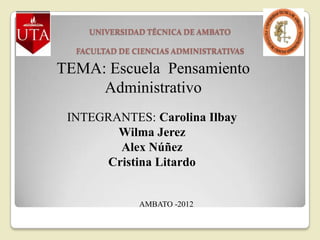 Este documento presenta un resumen de las principales escuelas del pensamiento administrativo, incluyendo la escuela científica, la escuela de la administración por etapas, la escuela de las relaciones humanas, la escuela sistémica, la escuela de la calidad, la administración por objetivos, la administración por valores y la escuela organizacional. Detalla los autores clave de cada escuela, sus aportaciones principales y algunas aplicaciones relevantes.