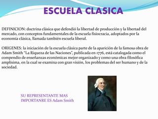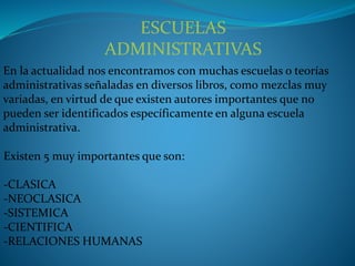 Este documento describe cinco importantes escuelas administrativas: la Escuela Clásica, la Escuela Neoclásica, la Escuela Sistémica, la Escuela Científica y la Escuela de Relaciones Humanas. Cada escuela se define brevemente y se identifica a su representante más importante, como Adam Smith para la Escuela Clásica y Elton Mayo para la Escuela de Relaciones Humanas.