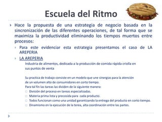 El documento presenta cuatro casos de negocio que ilustran las cuatro escuelas de operaciones: Escuela del Ritmo (La Areperia), Océano Azul (Nintendo Wii), Base de la Pirámide (Micro Seguros de CODENSA), y describe brevemente los principios clave de cada escuela y cómo cada caso de negocio los ejemplifica.