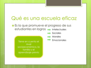 El documento describe las características de una escuela eficaz. Explica que una escuela eficaz promueve el progreso de los estudiantes en logros intelectuales, sociales, morales y emocionales, teniendo en cuenta factores como el nivel socioeconómico y el aprendizaje previo. Luego, detalla algunas prácticas educativas eficaces como la enseñanza directa, el aprendizaje cooperativo y el uso de las TIC. Finalmente, resume las aportaciones de las escuelas inclusivas y la importancia