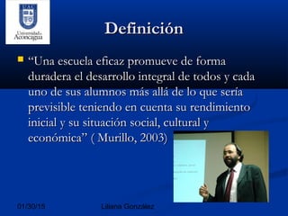 Este documento describe las características de las escuelas eficaces en Chile. Define una escuela eficaz como una que promueve el desarrollo integral de sus alumnos más allá de lo esperable considerando su situación inicial. Luego enumera 14 escuelas eficaces en Chile y describe las claves de su éxito, incluyendo una cultura escolar positiva, objetivos claros, buena gestión, atención a la diversidad de alumnos y enseñanza orientada a aprendizajes relevantes y significativos.