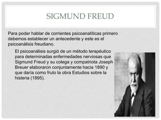 El documento resume las principales escuelas psicoanalíticas, incluyendo el psicoanálisis freudiano, la escuela psicoanalítica del yo, la escuela kleiniana, el psicoanálisis lacaniano y el psicoanálisis humanístico de Erich Fromm. Describe los conceptos clave de cada escuela como el inconsciente, las pulsiones, las defensas del yo, las posiciones esquizo-paranoide y depresiva, el estadio del espejo y la importancia de las relaciones interpersonales.