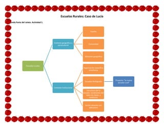 El documento describe la situación de las escuelas rurales en el caso de Lucía, incluyendo detalles sobre su familia, comunidad y contexto sociocultural, la ubicación geográfica de la escuela rural, su organización específica para la enseñanza, la estructura de la escuela y las condiciones del salón de clases, la acción docente y su adecuación, y el proyecto "la nueva escuela rural".
