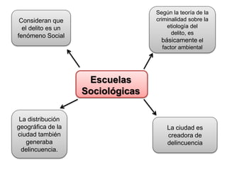 Este documento resume las principales escuelas sociológicas que consideran al delito como un fenómeno social. Describe la Escuela de Chicago, que utilizó métodos de observación y estadística para estudiar cómo el ambiente y la estructura de las ciudades generaban delincuencia. También resume las teorías de Gabriel Tarde sobre la imitación, Emile Durkheim sobre la conciencia social, y Alejandro Lacassagne sobre cómo la sociedad crea las condiciones para la delincuencia. En general, estas escuelas sociológicas veían al